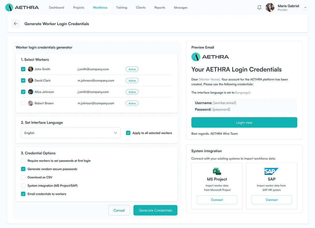 As we refine our integration capabilities, we’re designing a streamlined onboarding process for imported workers. The interface shown above illustrates our approach to credential generation, allowing for personalized welcome emails with interface language preferences and various security options. This functionality represents our commitment to making the transition process as smooth as possible for all stakeholders.